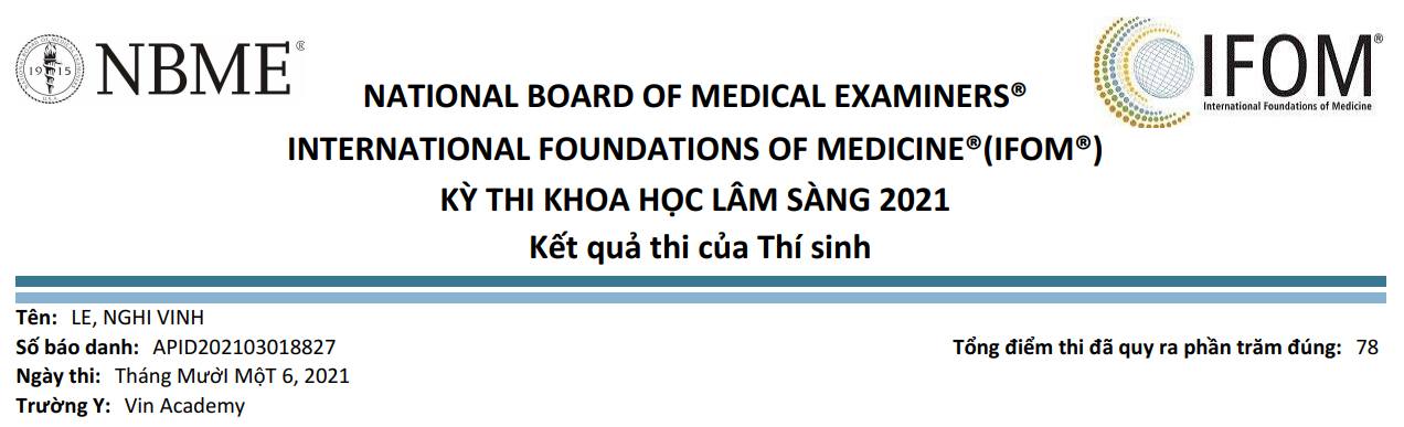 + IFOM CSE 78 điểm (bách phân vị 93). Điểm trung bình của thí sinh quốc tế nếu xét tương đương USMLE là 72 (bách phân vị 84). Còn điểm trung bình sinh viên quốc tế theo IFOM CSE thì Nghi không biết ạ. Nhưng mà thi không đủ điểm là không đạt. Đây là link để mọi người tham khảo: IFOM CSE – Score Interpretation 2021