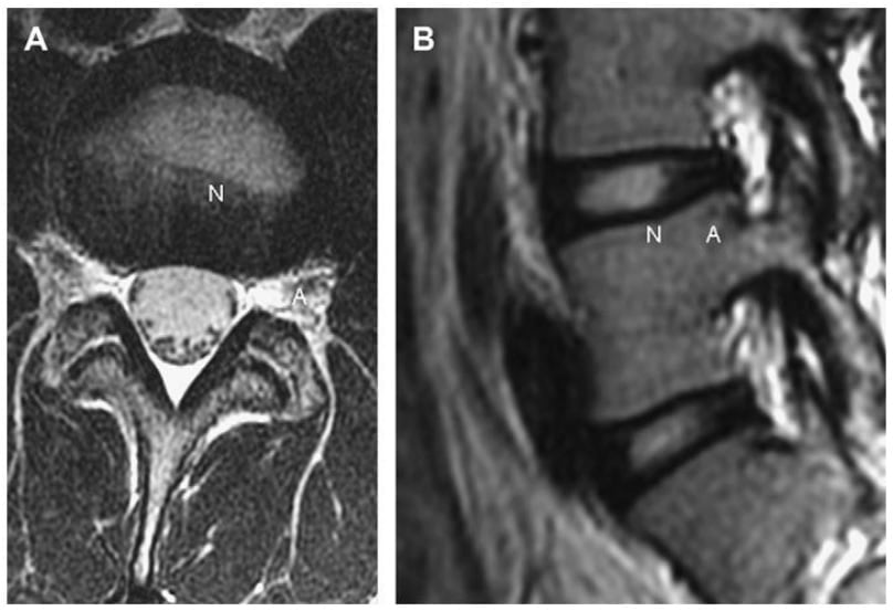 Hình 1. Axial (A) và Sagittal (B) T2W thấy tăng tín hiệu của nhân đĩa bình thường (N) và giảm tín hiệu của vòng xơ bình thường (A).