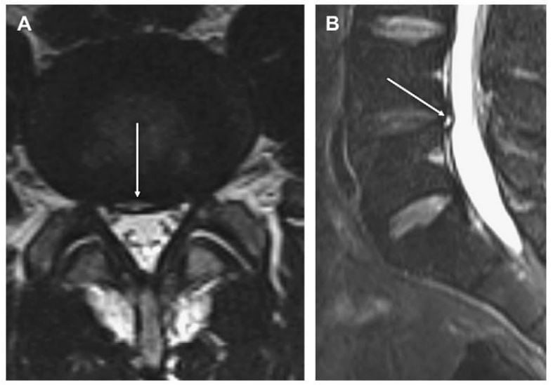 Hình 2. Axial (A) và sagittal (B) T2W thấy một vùng hình liềm (mũi tên) tăng tín hiệu (vùng tăng tín hiệu) ở phần sau củ đĩa đệm L4-L5. Đây là hình ảnh đặc trưng của rách vòng xơ.