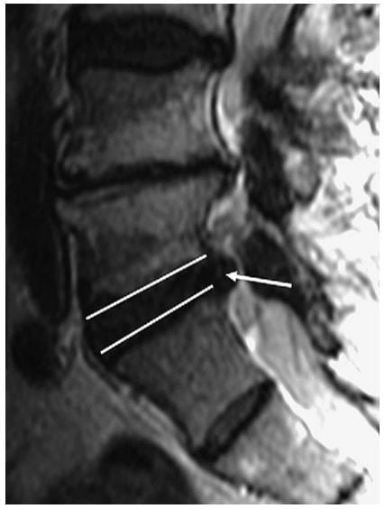 Hình 3. Hình sagittal T2W mô tả protrusion đĩa đệm L5-S1 (mũi tên trắng). Ghi nhận chất đĩa đệm thoát vị không vượt qua giới hạn của bờ trên và bờ dưới đĩa đệm (tức là vượt qua chỗ nối đĩa đệm/bề mặt thân sống). Khi xác định trên mặt cắt sagittal, thoát vị đĩa đệm này là protrusion.