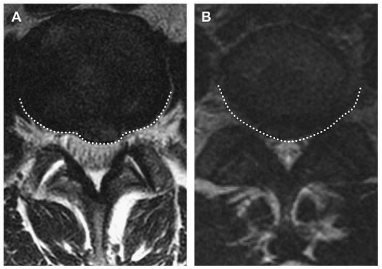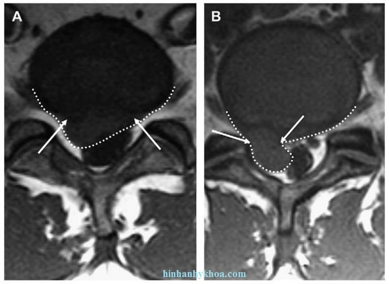 Hình 6. Hình axial T1W của cột sống thắt lưng ngang mức L4-5 cho thấy thoát vị đĩa đệm ra sau. (A) thoát vị (đường chấm trắng) thấy cổ rộng hơn (các mũi tên trắng); (B) thoát vị (đường chấm trắng) thấy cổ hẹp (các mũi tên trắng)