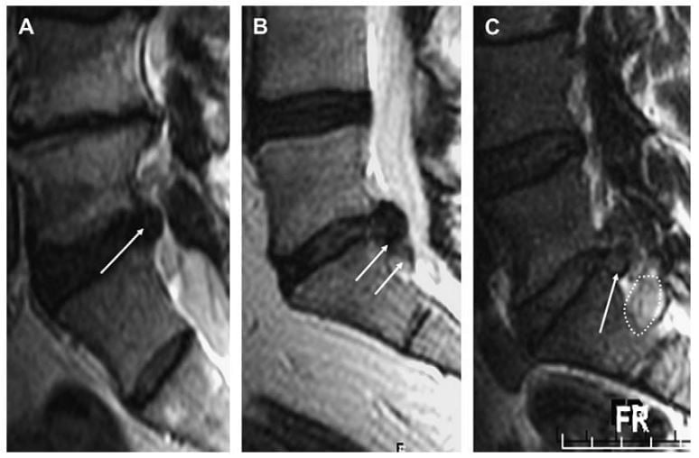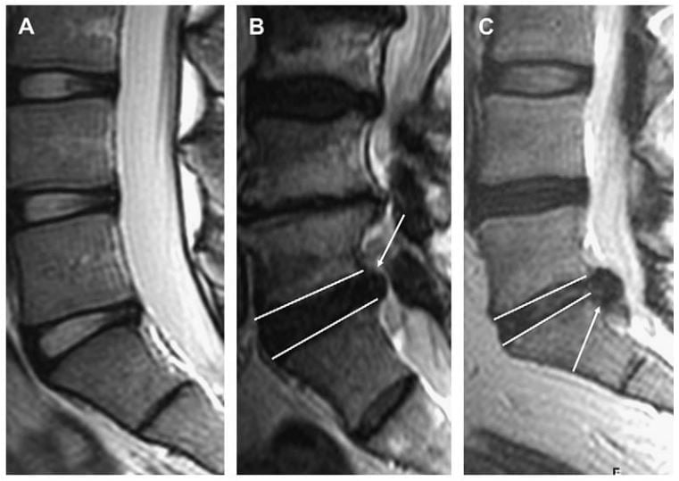 Hình 5. Hình MRI sagittal cột sống thắt lưng cho thấy đĩa đệm bình thường (A), protrusion L5-S1 (B), extrusion kèm di lệch xuống dưới ngang mức L5-S1 (mũi tên) (C). Các đường trắng chỉ ra bờ trên và bờ dưới đĩa đệm L5-S1 ở hình B và C. Protrusion không vượt qua chiều trên – dưới đĩa đệm trên hình sagittal (B), trong khi extrusion vượt qua bờ này (C).