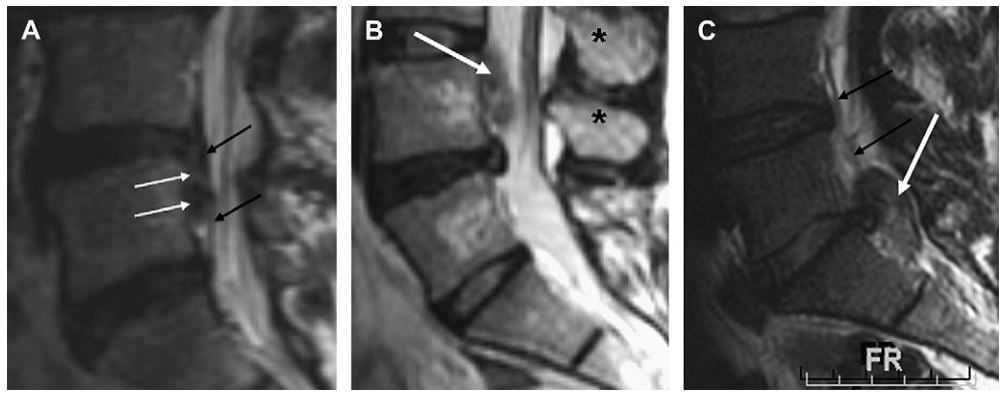 Hình 8. Sagittal T2W thắt lưnh cùng ở các bệnh nhân khác nhau minh hoạ nhiều loại thoát vị đĩa đệm. (A) thoát vị đĩa đệ lan xuống duới từ gốc ở đĩa đệm L4-L5 (mũi tên trắng) và nằm ngay trước dây chằng dọc sau (mũi tên đen) trong khoang ngoài màng cứng phía trước. Extrusion đĩa đệm (mũi tên trắng) nằm ở đường giữa (ghi nhận mỏm gai chỉ ra bằng các dấu sao đen) và ngay phía sau dây chằng dọc sau, không thấy rõ trên hình đường giữa vì dính trực tiếp vớiphần sau thân sống. Thoát vị đĩa đệm được xác định là lan vào trong ống sốngxuyên qua dây chằng dọc sau (thoát vị xuyên dây chằng). (C) thoát vị đĩa đệmthấy phía sau dây chằng dọc sau (mũi tên đen) và bắt nguồn ở ngay phía bên của dây chằng dọc sau. Dây có thể gọi là thoát vị ngoài dây chằng.