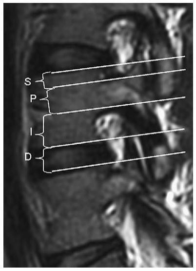 Hình 9. Hình sagittal T2W chỉ ra các mức thoát vị. D, mức đĩa đệm; I, dưới cuống; P, cuống; S, trên cuống.