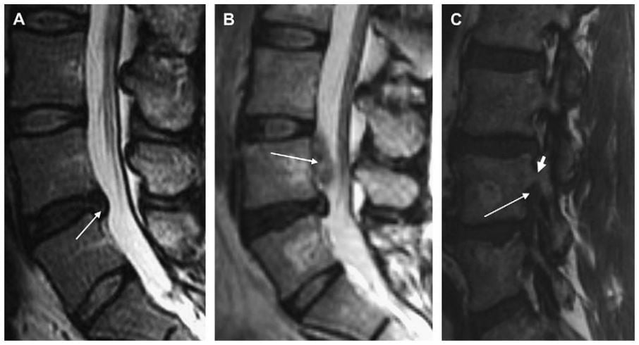 Hình 10. Hình sagittal T2W (A, B) và sagittal T1W (C) của cột sống thắt lưng chỉ ra nhiều loại thoát vị đĩa đệm khác nhau ở các mức khác nhau. (A) thoát vị đĩa đệm ngang mức L4-L5 có di lệch nhẹ thoát vị xuống dưới (mũi tên trắng); thoát vị này nằm ở mức trên cuống. (B) extrusion đĩa đệm bắt nguồn từ L4-L5 với mảnh thoát vị rời ở mức cuống sống (mũi tên trắng). (C) thoát vị đĩa đệm bắt nguồn từ L4-L5 lan lên trên để nằm ở vị trí dưới cuống (mũi tên trắng). Cuống sống (đầu mũi tên trắng) thấy ngay phía trên của thoát vị.