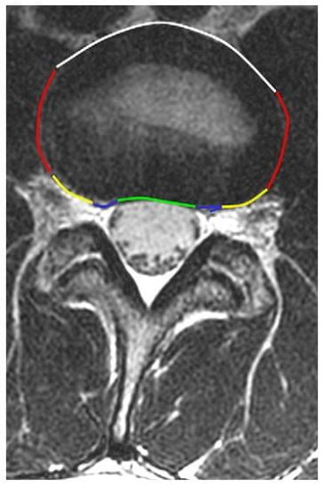 Hình 11. Hình axial T2w ngang qua đĩa đệm L3-4 chỉ ra các vùng đĩa đệm khác nhau được xác định trên hình axial. Đoạn đường màu xanh lá cây chỉ ra vùng trung tâm, đường máu xanh biển chỉ ra vùng dưới mặt khớp, đường màu vàng chỉ ra vùng lỗ liên hợp, đường màu đỏ chỉ ra vùng ngoài lỗ liên hợp và đường màu trắng là vùng phía trước.