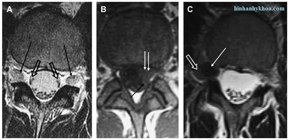 Hình 12. Hình axial T2W (A, C) và T1W (B) chỉ ra các dấu hiệu khác nhau. (A) các rễ thoát thần kinh bình thường (mũi tên đen) và các rễ thần kinh chạy ngang bình thường (mũi tên đen hở). (B) Protrusion dưuói mặt khớp và trung tâm trái (mũi tên trắng) đẩy lệch rễ thần kinh chạy ngang (mũi tên đen). (C) thoát vị đĩa đệm trong lỗ liên hợp đẩy lệch rễ thoát thần kinh (mũi tên trắng hở) về phía sau bên.