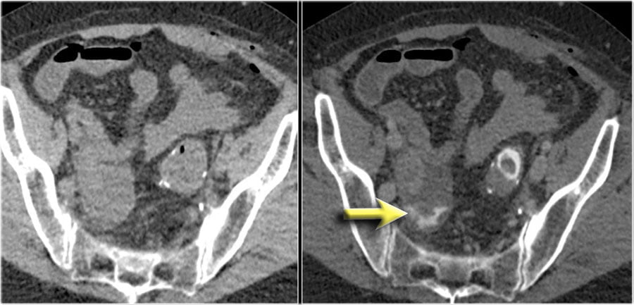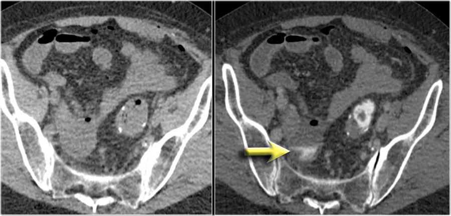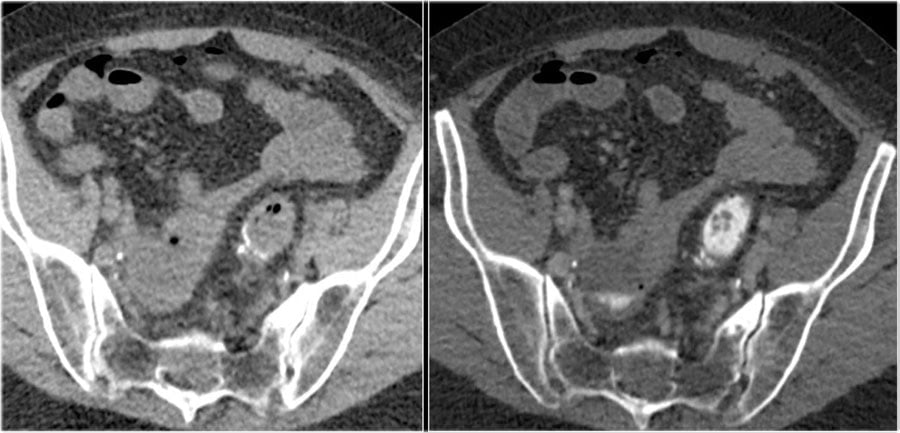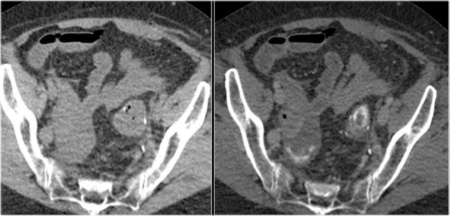 Compare the NECT without oral or rectal contrast on the left with the images on the right after rectal contrast.