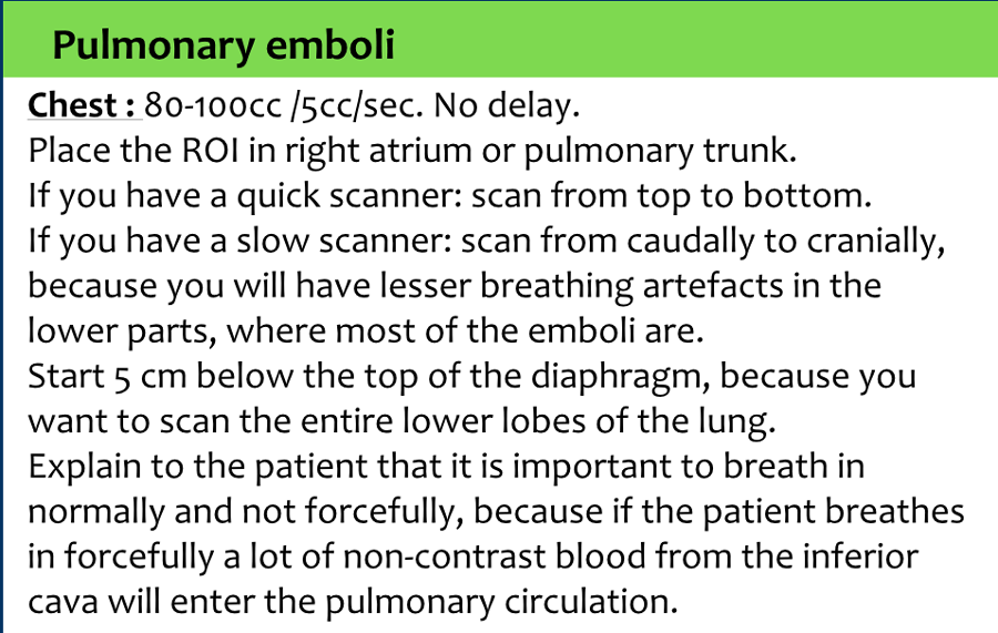 We prefer to scan from bottom to top, because if a patient can’t hold his breath, then you will have less breathing artefacts in the lower lobes, where most of the emboli are located. In the upper lobes breathing does not cause that much movement as in the lower parts of the lung.