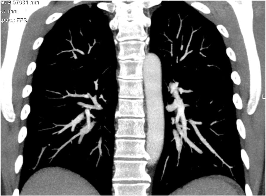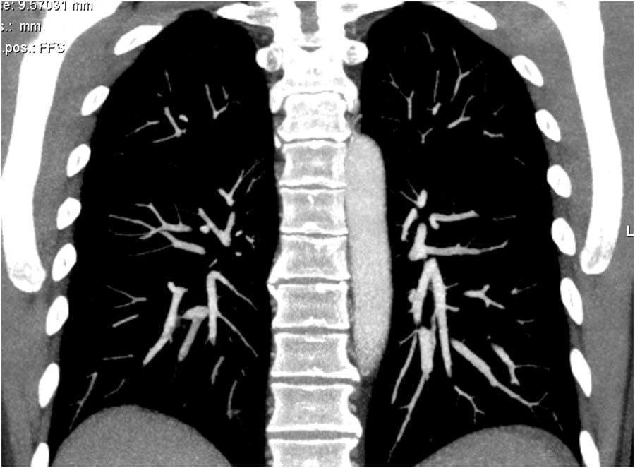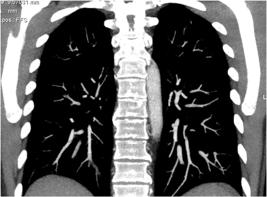– Older patients usually have a poor cardiac output, which results in a compact contrast-bolus and good enhancement of the pulmonary vessels (see image 1).