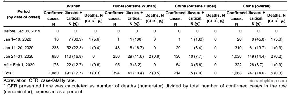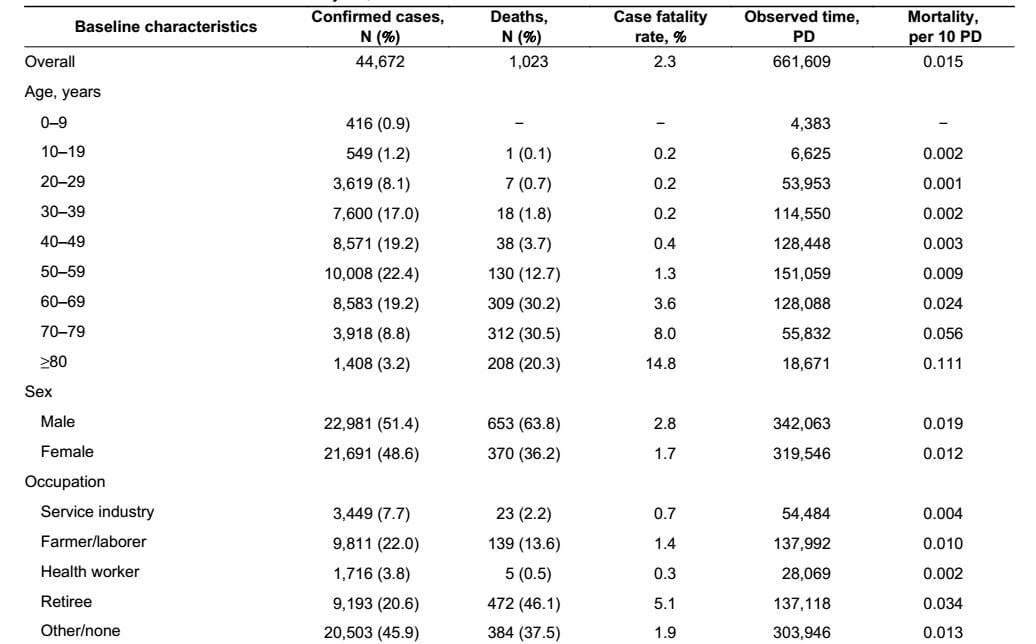 Như được hiển thị trong Bảng 1, tổng số 1.023 trường hợp tử vong đã xảy ra trong số 44.672 trường hợp được xác nhận với tỷ lệ tử vong trong trường hợp (case fatality rate) tổng thể là 2,3%. Ngoài ra, 1.023 trường hợp tử vong này xảy ra trong thời gian quan sát được 661.609 người (PD), với tỷ lệ tử vong là 0,015/10 PD.