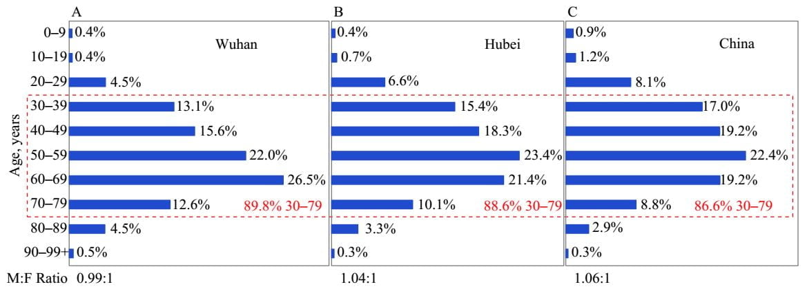 Sự phân bố tuổi của các trường hợp chỉ ở Vũ Hán, ở tỉnh Hồ Bắc nói chung và ở Trung Quốc nói chung được trình bày trong Hình 1. Tỷ lệ các trường hợp được xác nhận 30-79 tuổi ở ngày chẩn đoán là 89,8% cho các trường hợp Thành phố Vũ Hán so với 88,6% ở tổng thể Hồ Bắc (bao gồm Vũ Hán) và 86,6% ở Trung Quốc nói chung (bao gồm tỉnh Hồ Bắc và tất cả 30 bộ phận hành chính cấp tỉnh khác, hoặc PLADs). Tỷ lệ nam:nữ là 0,99:1 ở Vũ Hán, 1,04:1 ở Hồ Bắc và 1,06:1 ở Trung Quốc nói chung.
