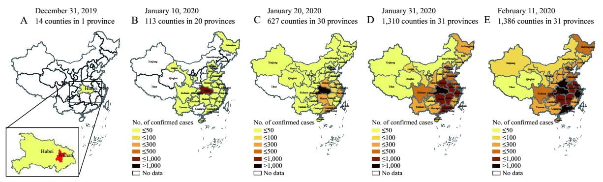 HÌNH 2. Sự lan truyền theo thời gian của COVID-19 tại Trung Quốc cho đến ngày 11 tháng 2 năm 2020. (A) tổng cộng 14 khu vực hành chính cấp quận (sau đây là các quận) chỉ ở tỉnh Hồ Bắc đã báo cáo các trường hợp kể từ ngày 31 tháng 12, 2019; (B) trước ngày 10 tháng 1 năm 2020, 113 quận trong 20 PLAD đã báo cáo các trường hợp có tỷ lệ lưu hành cao nhất vẫn còn ở tỉnh Hồ Bắc; (C) chín ngày sau, vào ngày 20 tháng 1, 627 quận trong 30 PLAD đã báo cáo các trường hợp và PLADs lân cận tỉnh Hồ Bắc đã quan sát thấy tỷ lệ lưu hành ngày càng tăng; (D) vào cuối ngày 31 tháng 1, 1310 quận trên tất cả 31 PLAD bị ảnh hưởng và tỷ lệ lưu hành ở các khu vực trung tâm, nam và nam trung bộ đã tăng đáng kể; (E) vào cuối ngày 11 tháng 2, 1.386 quận trên toàn quốc đã bị ảnh hưởng và tỷ lệ lưu hành ở PLADs miền trung nam đã tăng lên đến mức của Hồ Bắc.