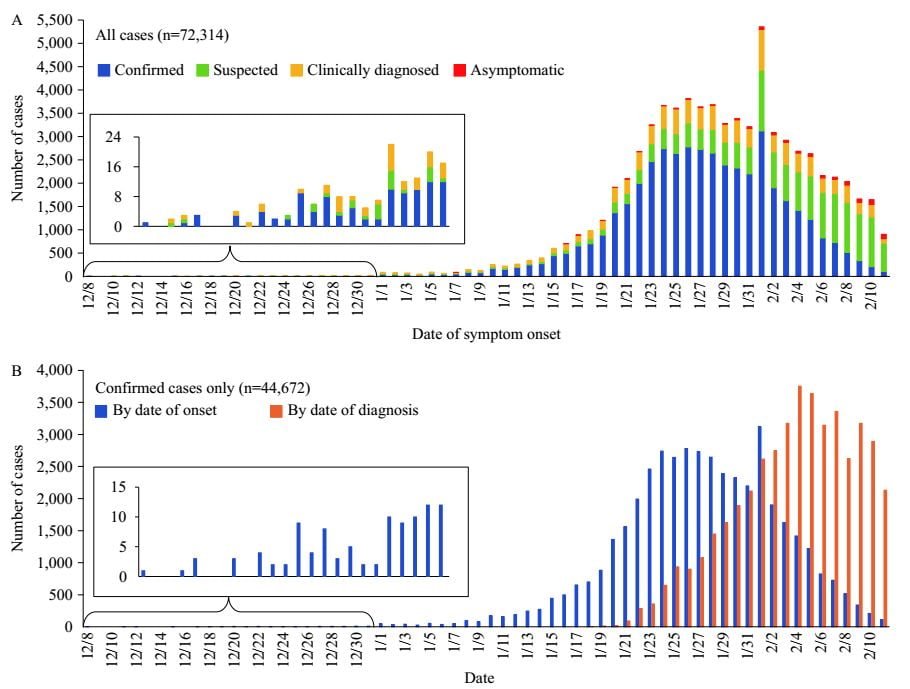 Hình 3 cho thấy đường cong dịch bệnh COVID-19 với số trường hợp được vẽ theo ngày bệnh nhân khởi phát các triệu chứng từ ngày 8 tháng 12 năm 2019 đến ngày 11 tháng 2 năm 2020. Xác nhận, nghi ngờ, chẩn đoán lâm sàng và các trường hợp không có triệu chứng được xếp chồng lên nhau để hiển thị tổng số trường hợp hàng ngày ngày khởi phát triệu chứng. Hình nhỏ cho thấy vào tháng 12 năm 2019 chỉ có 0-22 trường hợp/ngày bắt đầu gặp các triệu chứng. Các triệu chứng khởi phát cao nhất cho tất cả các trường hợp xảy ra vào ngày 1 tháng 2 năm 2020. Kể từ đó, bệnh khởi phát đã giảm.