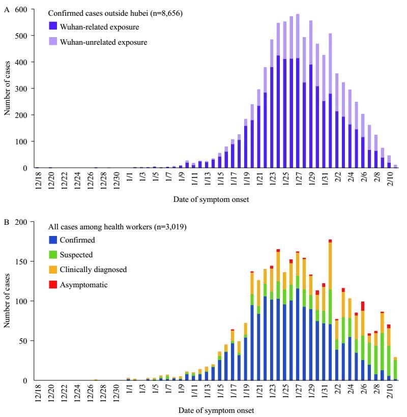 Hình 4 cho thấy đường cong dịch bệnh COVID-19 với số trường hợp được vẽ theo ngày bắt đầu có triệu chứng từ ngày 18 tháng 12 năm 2019 đến ngày 11 tháng 2 năm 2020 đối với hai nhóm nhỏ được xác nhận là các trường hợp được xác nhận bên ngoài tỉnh Hồ Bắc (Hình 4A) và tất cả các trường hợp trong số đó nhân viên y tế trên toàn quốc (Hình 4B). Thời điểm cao nhất của các triệu chứng khởi phát trong số các trường hợp bên ngoài tỉnh Hồ Bắc xảy ra vào ngày 27 tháng 1. Hầu hết các trường hợp này (85,8%) cho biết gần đây đã cư trú hoặc đến thăm Vũ Hán hoặc có liên hệ chặt chẽ với một người nhiễm bệnh từ Vũ Hán. Thời điểm cao nhất của các triệu chứng khởi phát trong số các trường hợp nhân viên y tế xảy ra vào ngày 1 tháng Hai. Trong số 42 cơ sở y tế phục vụ bệnh nhân COVID-19, tổng cộng có 3.019 nhân viên y tế đã bị nhiễm bệnh (1.716 trường hợp được xác nhận) và 5 người đã chết.