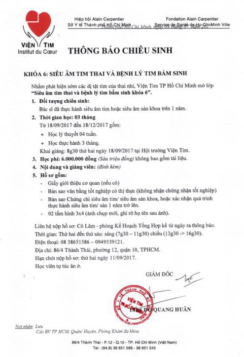 • Thông tin khóa học mới và hồ sơ: liên hệ phòng Kế Hoạch Tổng Hợp Viện Tim, Điện thoại: 028 38651586 – 0949539121. Địa chỉ: 86/4 Thành Thái, phường 12, quận 10, TPHCM.