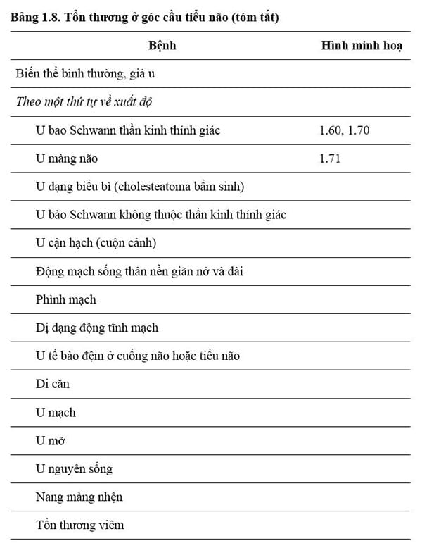 Trong khi CHT dường như là phương pháp hình ảnh tốt nhất để khảo sát các thành phần của thần kinh thính giác sau ốc tai (thần kinh), XQCLĐT được chuộng trong đánh giá thành phần ốc tai (cảm giác). Bảng 1.8 bàn về các tổn thương ở góc cầu tiểu não theo xuất độ ước chừng.