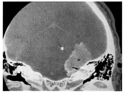 – Khối u ở đáy sọ hoặc ở phần nền xương chẩm, chủ yếu thuộc đường giữa, lớn, mật độ ngang hoặc cao, gây hủy xương.