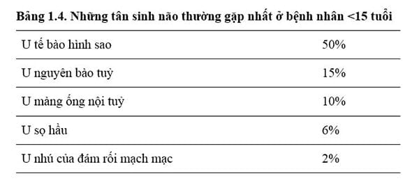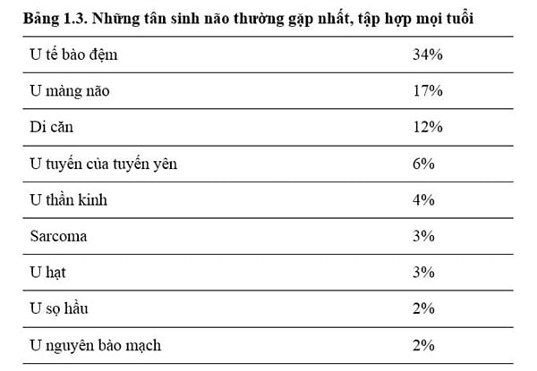 U não chiếm 9% trong tổng số các tân sinh nguyên phát; trong nhóm nhi (dưới 15 tuổi) chiếm 15%. Bảng 1.3 liệt kê các u não thường gặp nhất không theo tuổi và bảng 1.4 là các u não thường gặp nhất trong nhóm bệnh nhi.