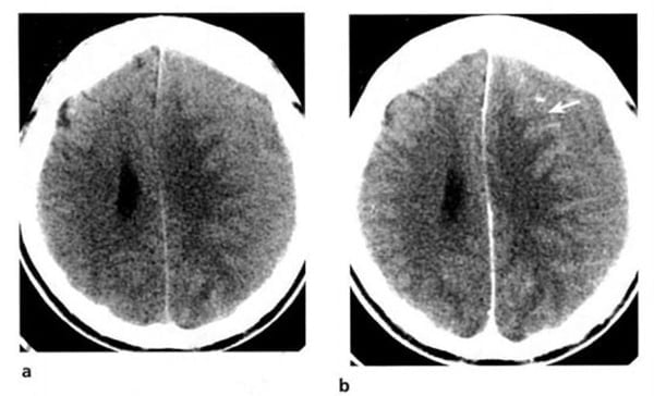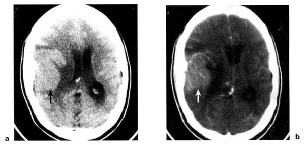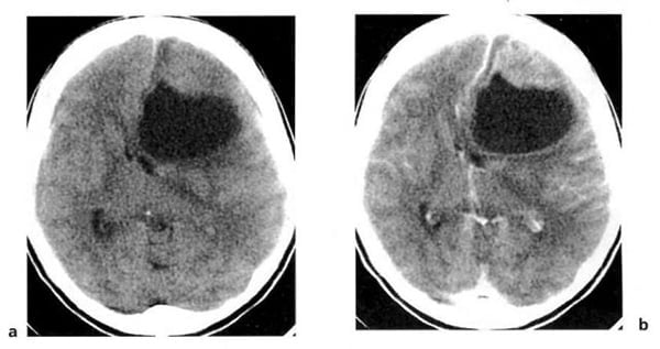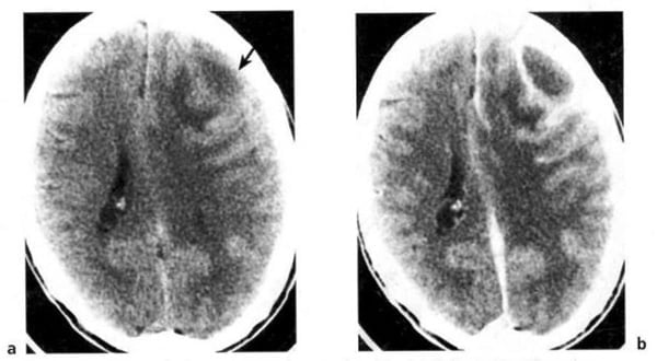 Hình 1.47. Khối máu tụ bán cấp dưới màng cứng có mật độ ngang. Trước tiêm, chỉ thấy hiệu ứng choán chỗ và xóa mất não thất bên bên trái (a). Sau tiêm (b), các tĩnh mạch bề mặt hiện lên (mũi tên) cho thấy rõ hơn ranh giới của khối tụ máu.