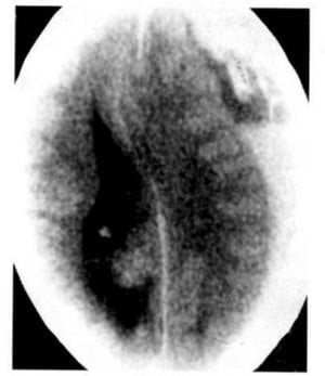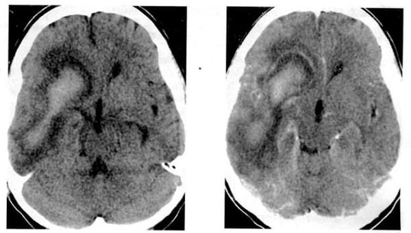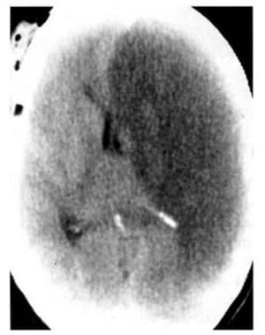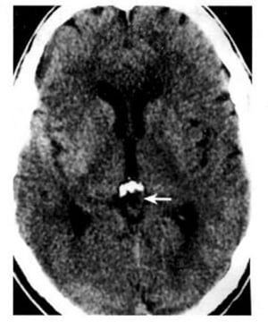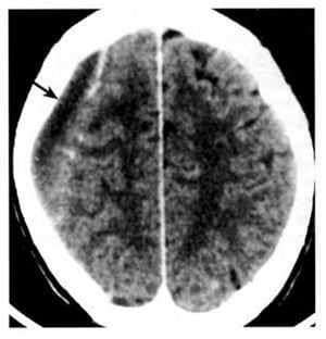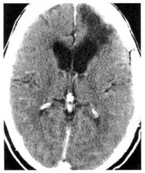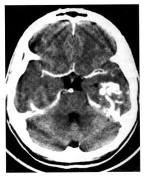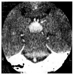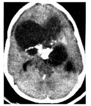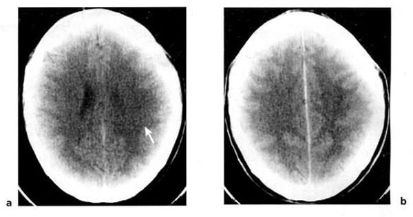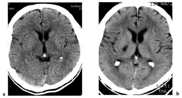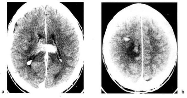 – Khi hiện diện cân xứng cả hai bên, đôi khi khó phát hiện nếu có mật độ ngang với vỏ não bên dưới. Tiêm chất cản quang để tìm những dấu hiệu gián tiếp.