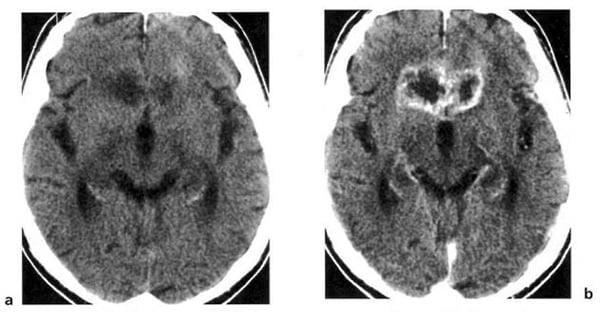 Hình 1.32. U nguyên bào đệm đa dạng. Hình ảnh trước tiêm (a) là tổn thương mật độ thấp ở hai bên đường giữa. Ở thùy trán bên trái còn có một tổn thương mật độ cao (xuất huyết). Sau tiêm (b), bắt chất cản quang mạnh, dạng viền.