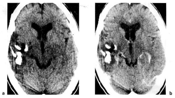 Hình 1.50. Phình mạch của động mạch não giữa, với máu tụ cũ nội sọ sau 4 tháng. Cùng bệnh nhân trong Hình 1.44. Trước tiêm (a), phình mạch có dạng mật độ cao nhỏ, máu tụ mãn tính mật độ thấp bao quanh (mũi tên). Sau tiêm (b), cho thấy phình mạch với huyết khối bán phần rõ hơn (mũi tên).