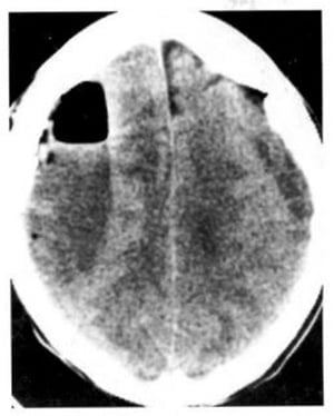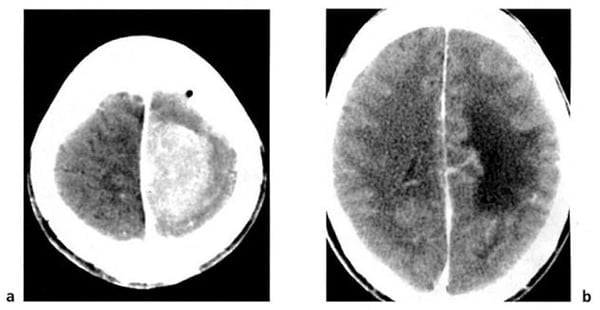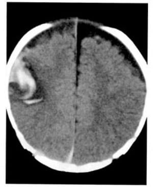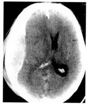 Hình 1.43. Khối máu tụ tươi trong não ở một trẻ nhỏ. Máu có mật độ cao trong bán cầu não bên phải, phù mật độ thấp bao quanh. Tụ dịch mãn dưới màng cứng hai bên. Đây là một trường hợp trẻ bị bạc đãi.