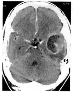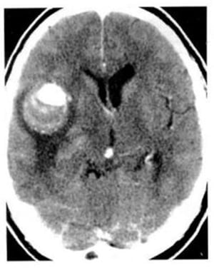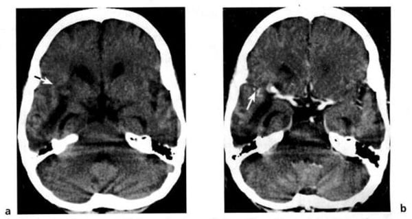 Hình 1.18. Áp xe não trong giai đoạn viêm não sớm. Khối đồng nhất ở thùy thái dương bên phải (a, mũi tên) với bắt chất cản quang trung bình (b) và phù nề mật độ thấp bao quanh.